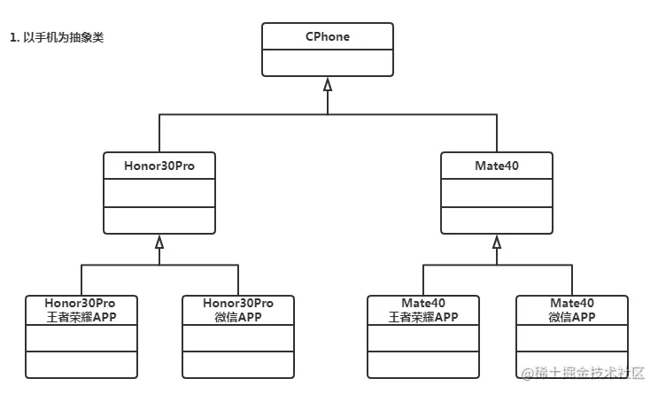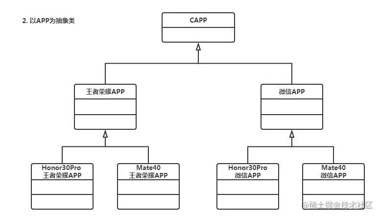 遇到此类场景时,通常我们会抽象出手机类,然后在不同的手机上实现客制化的APP(假设不同的手机品牌安装同一款APP会有一些参数差异)。