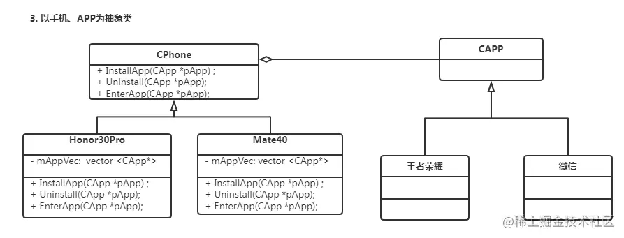 当回头再分析场景时,发现场景存在两个实例,手机和APP,且为“has a”的关系,即聚合。那么可将手机与APP分别抽象,实现聚合的关系,子类无需关心两者间的关系。