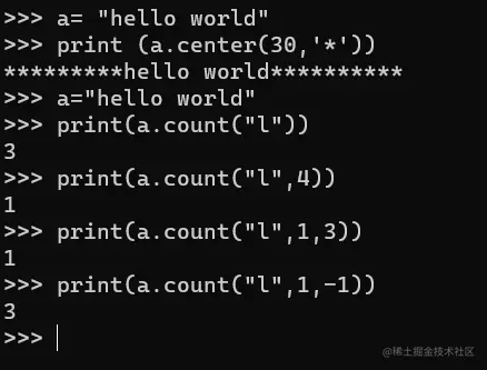 print(a.count("l",1,-1)) #统计子字符串“l”在字符串“hello world”出现了多少次,从第一个索引位置开始,到倒数第一个(最后一个)索引位置结束;