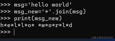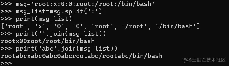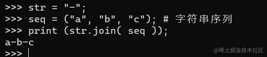描述:用于将序列中的元素以指定的字符连接生成一个新的字符串,多用于字符串拼接