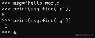 描述:查找“g”在字符串当中的位置,如果存在返回索引位置,不存在则返回-1,如果存在多个,则只会返回第一个索引位置,不会报错