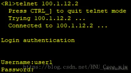 (2)配置R2可以通过用户名user1以及密码huawei@123进行Telnet登陆,用户登陆后的权限为3级权限。配置完成后可以在R1上进行Telnet测试