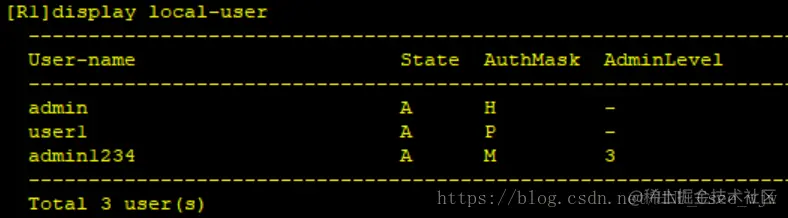 [R2-aaa]local-user user1 password cipher huawei@123 privilege level 3