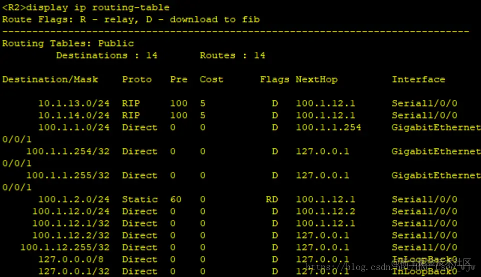 [S2]ip route-static 100.1.1.0 24 10.1.14.1
