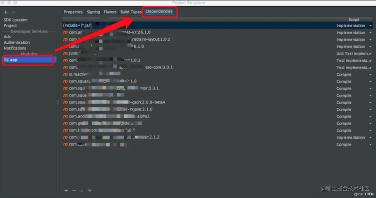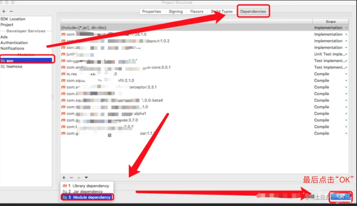 六、弹出Project Structure主界面,然后点击“**Dependencies”**模块,找到第一行,然后选择下拉弹框选择中的“**Module dependency”**选项,点击“**OK”**按钮即可。