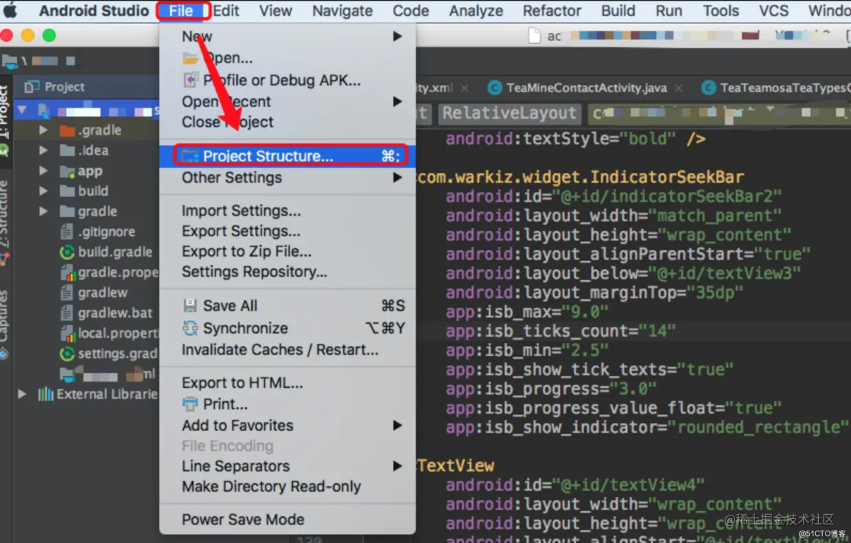 2、点击左侧顶部**File—>Project Structure…**直接进入的方法