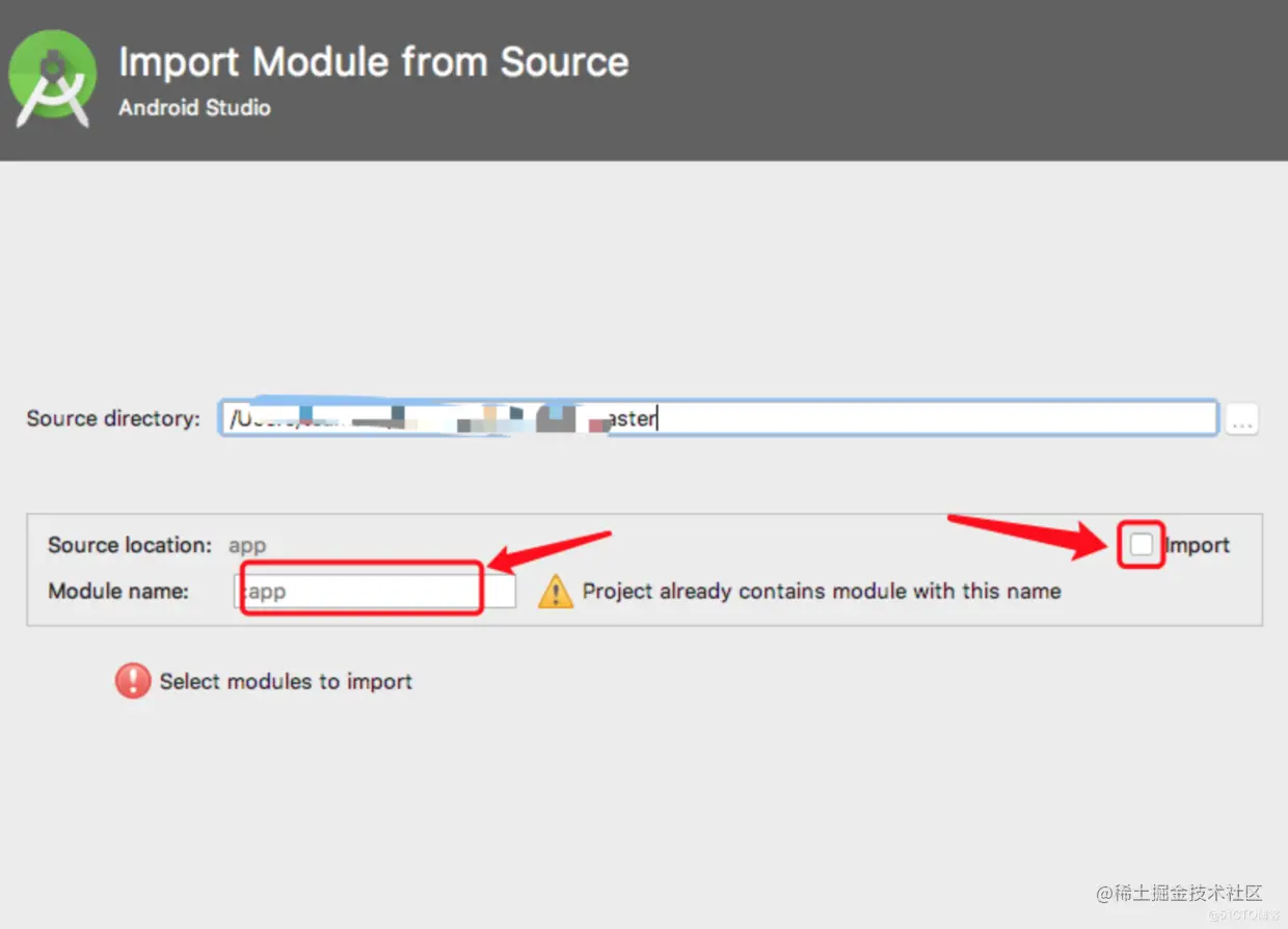 三、根据实际情况修改Module名称,如果没有重名可以不修改;而且需要勾选右侧的 **“Import”**选项,最后点击 **“Finish”**按钮