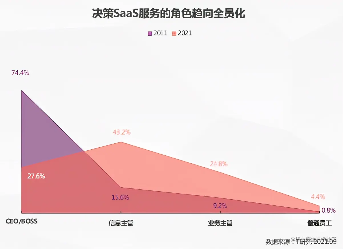 2011年左右,SaaS服务的采购决策者主要是企业的所有者和高层决策者,即便有CIO这样的信息化角色,但老板、CEO才是一锤定音的关键人物。