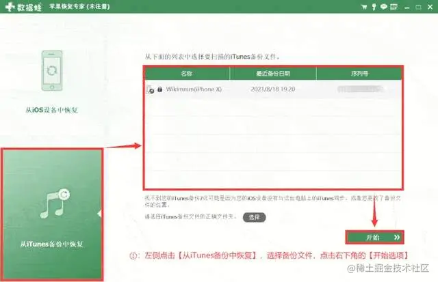 - 步骤二: 打开软件后,选择:从“从iTunes备份中恢复”模式,软件会自动检测电脑上所有的iTunes备份文件,点击需要提取资料的文件,之后开始扫描。