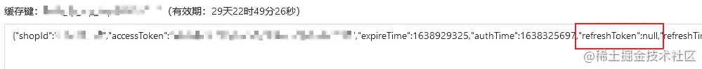 问题就出在两者共用了一个缓存 key ,服务 A 出于节省原则,获取用户授权信息的时候并未在缓存里塞入 refreshToken ,这导致授权服务去获取用户授权信息时,由于命中了缓存,直接从缓存里拿值,而缓存里并没有 refreshToken 的值,所以调用第三方刷新 token 接口的时候, refreshToken 传的值是空!