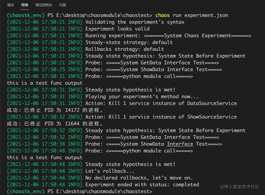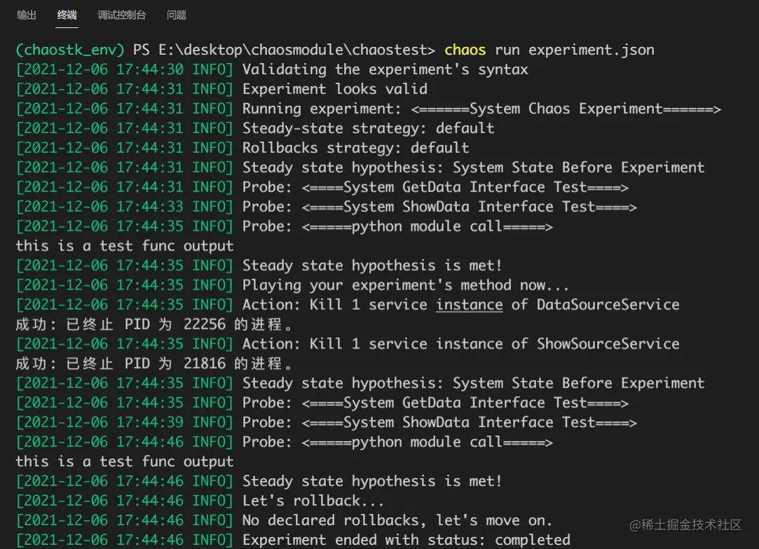 说明chaostoolkit为我们发现了系统的韧性不足,是在验证<====System GetData Interface Test====>这个阶段检测出来的