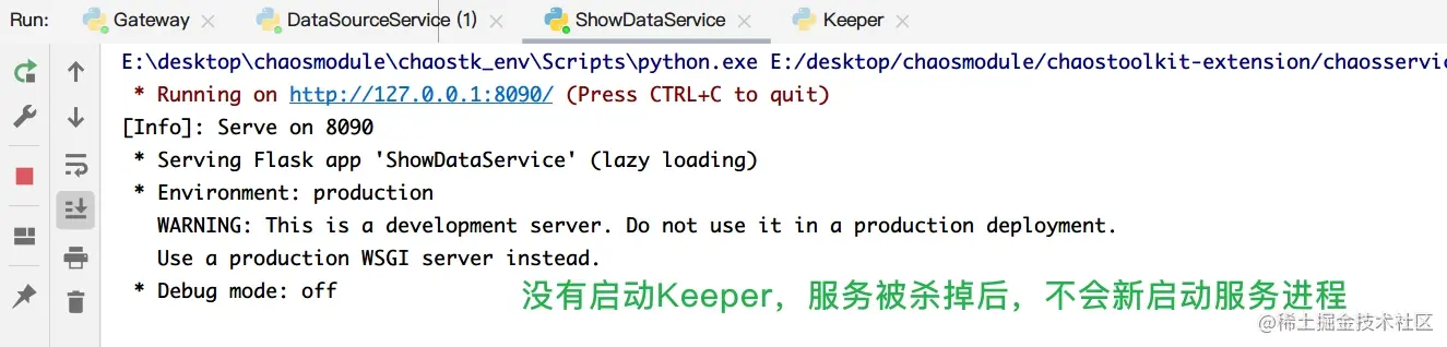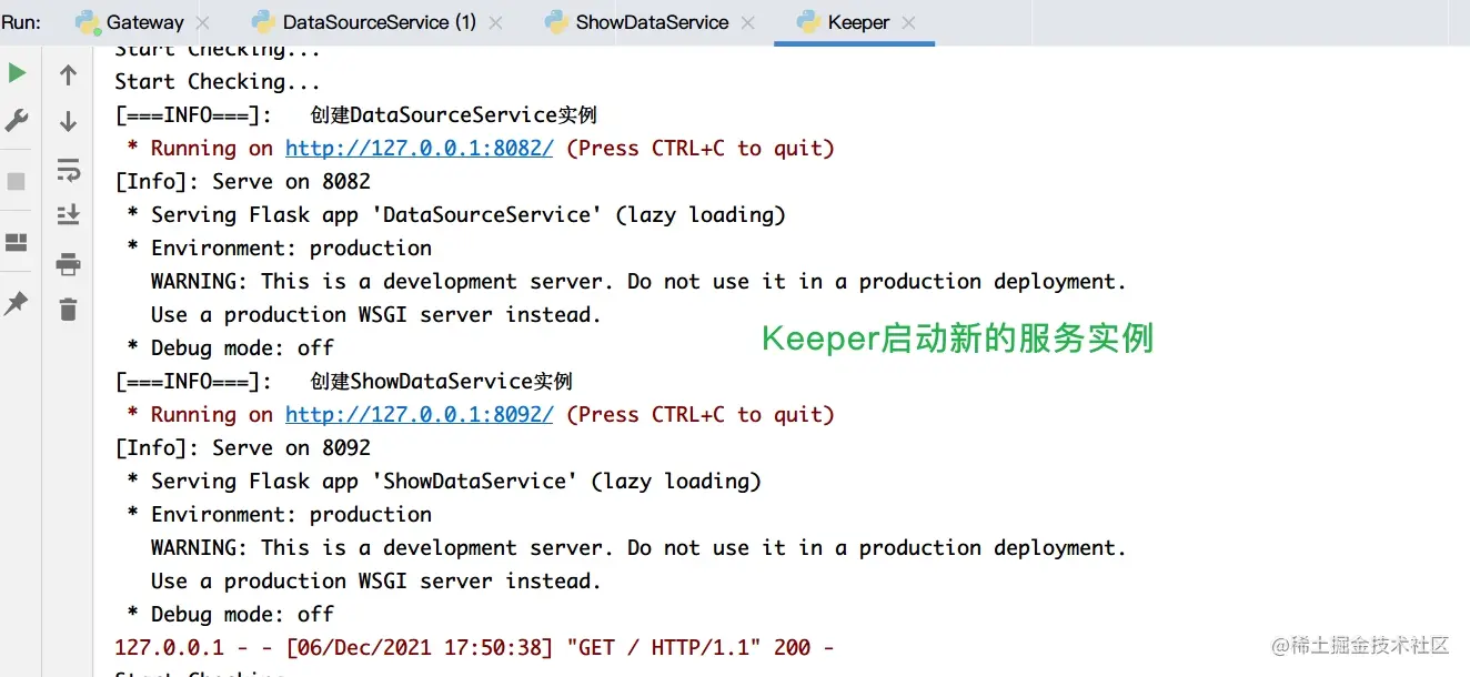 DataSourceService: 模拟一个数据库服务,代表整个系统的数据源ShowDataService: 模拟一个展示数据的前台服务Gateway: 模拟Nginx进行请求转发Keeper: 后台守护进程,在服务不可用的时候,自动创建新的服务进程实例