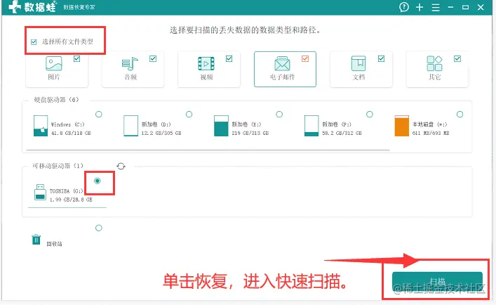 步骤一:在你的电脑上,进入数据蛙数据恢复专家软件的官方网站,点击下载按钮进行软件的下载。安装软件时要注意尽量不要将软件安装到丢失数据的硬盘,防止数据的覆盖。如果你的硬盘是外接硬盘,那么你还需要将硬盘和你的电脑连接。接着单击图标运行软件。在运行界面勾选需要恢复的数据类型和已插入的外接硬盘。