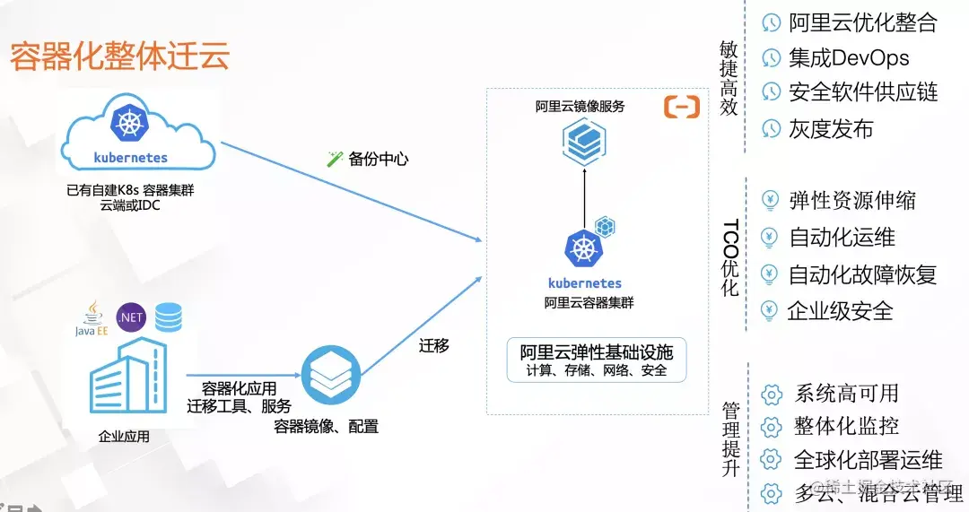 为了帮助用户提高迁云的效率,我们也在持续积累和开源一些迁云工具及产品。比 ack-image-builder 为用户提供创建 ACK 集群节点自定义镜像的模板并通过校验模块检查自定义镜像是否满足 ACK 集群要求;sync-repo 能够帮助用户快速完成容器镜像批量迁移至 ACR(容器镜像仓库服务); 备份中心为无状态或有状态应用的备份、恢复与迁移提供了一站式的解决方案,特别是对混合云,多集群的有状态应用提供了数据容灾和应用迁移能力,能够帮助用户快速把其他云厂商或者自建 Kubernetes 集群下的完整应用及 PV 数据迁移至 ACK 集群,并支持丰富的云下存储类型。