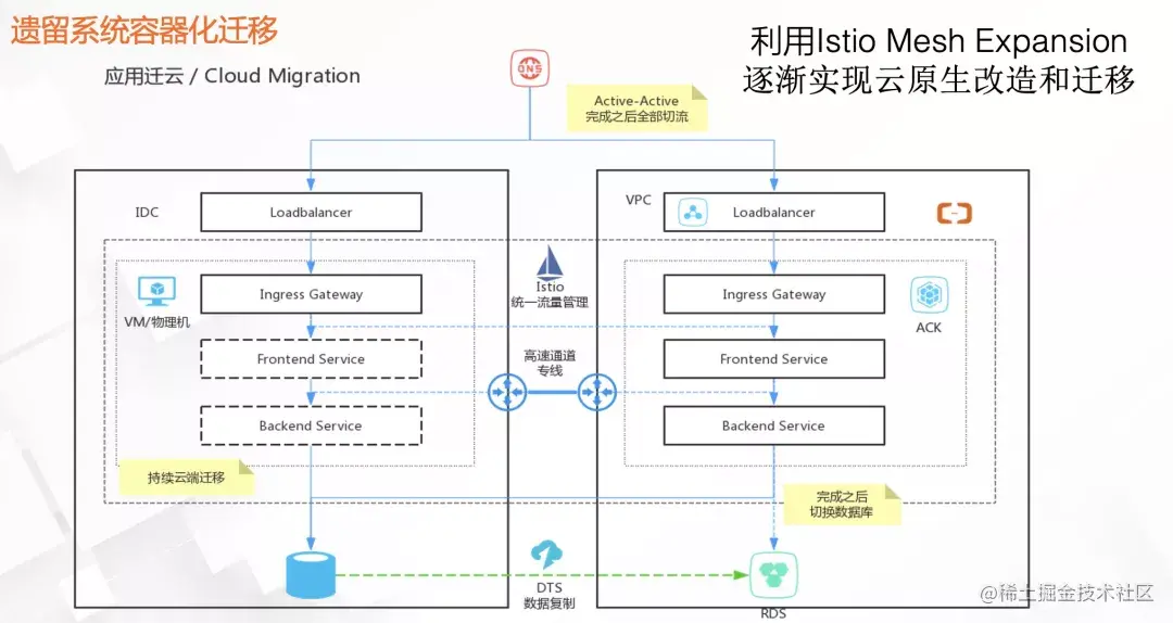 对于应用改造和优化这部分,Kubernetes 到 Kubernetes 的场景下,需要优化的是去适配自动扩容等自建 Kubernetes 不具备的那些能力,在传统应用迁移到 ACK 的场景下,这部分的工作量会更大些,所以我们针对这个场景也输出了一些方案,比如类似于异地多活的方案,我们把用户传统应用环境,通常是虚拟机或者裸机环境集成到线上 ACK 部署的 Istio 网格中,逐步改造应用直至业务全部切换到线上 ACK 集群。