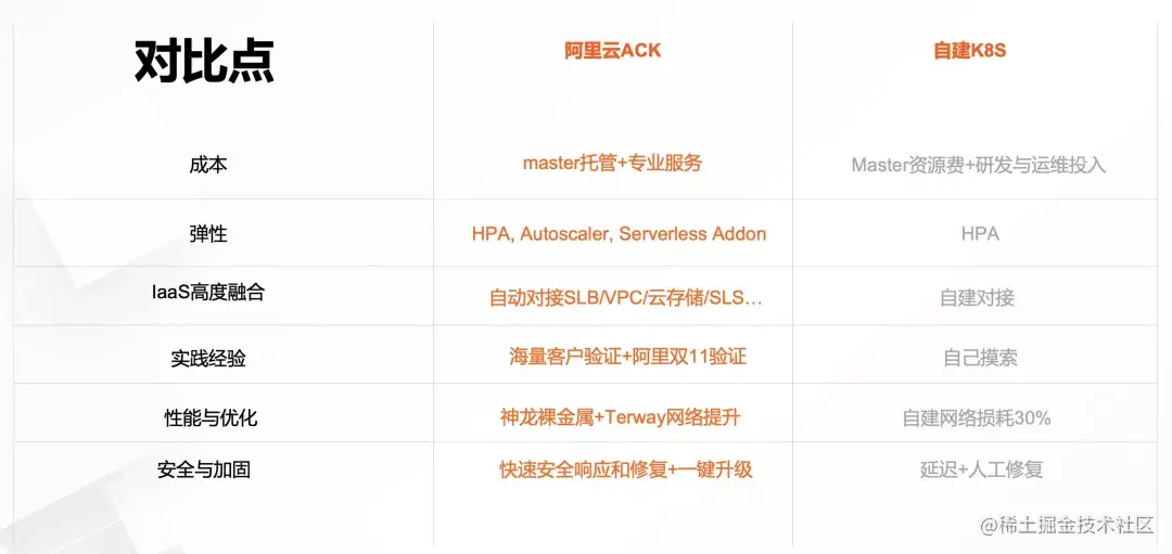 在我们过去帮助用户业务上云的案例中,绝大部分是自建 Kubernetes 集群迁移到 ACK 集群,与自建 Kubernetes 集群相比较,ACK 在成本、弹性、IaaS 高度融合、性能、安全加固以及实践经验等方面都有非常巨大的优势。