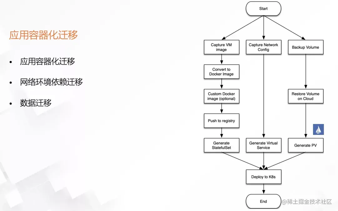 容器化整体迁云这部分还有两个小场景,一个是用户从自建 Kubernetes 集群迁移到 ACK,此场景下用户的应用已经做了很大一部分的云原生化改造,迁移工作相对来说会简单些,还有一部分用户的应用是传统应用,直接运行在虚拟机或者裸金属服务器上,没有做过任何云原生化的改造,对于这部分场景,我们也提供了相关工具或方案帮助用户进行云原生化的迁云改造,比如使用 derrick 项目可以自动检测源码项目类型并生成 Dockerfile 和用于应用部署编排的 yaml 文件。