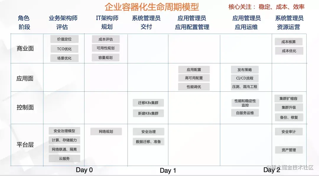 我们提供了一个企业容器化生命周期模型,这个模型是根据时间阶段和用户侧各个业务角色来划分的,比如业务架构师角色需要关心的是业务上云能给公司带来什么价值,在 TCO 和场景上会带来哪些优化,云平台在安全性以及计算、存储、网络能力上是否能满足当前业务需求;IT 架构师负责规划当前业务需要的集群容量和规模以及网络选型等问题,剩下的就是系统管理员与应用管理员把迁云方案的各个细节落实下来。这个模型的主要核心关注点是让用户的业务上云后能更稳定、成本更低、效率更高。