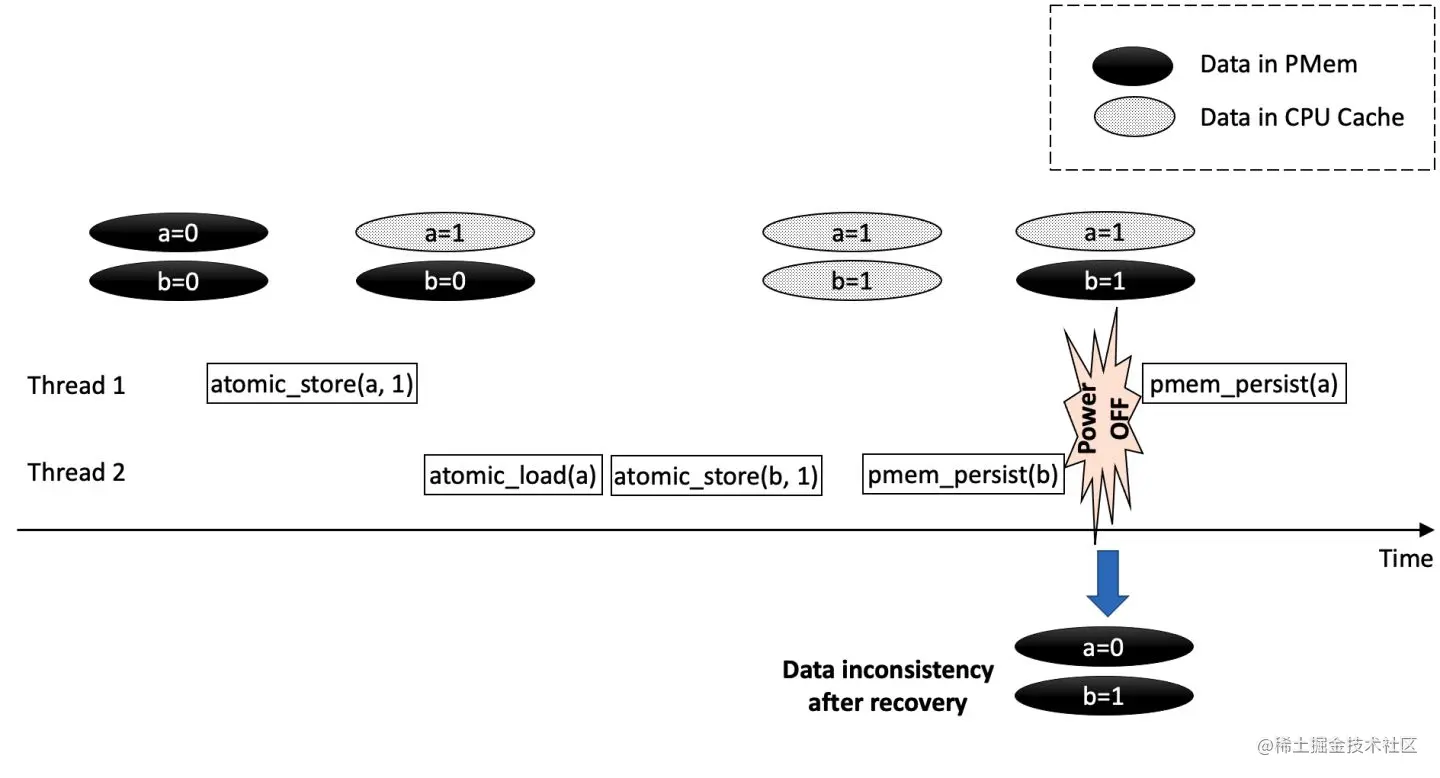 但是如图1所示,如果考虑到PMem的持久化特性带来的数据可恢复性,如果在线程1刚执行完atomic_store未执行pmem_persist时,而线程2执行完pmem_persist后系统掉电,由于pmem->a并未持久化pmem->b已持久化,将会导致pmem->a=0,pmem->b=1这种未预料到的情况发生。