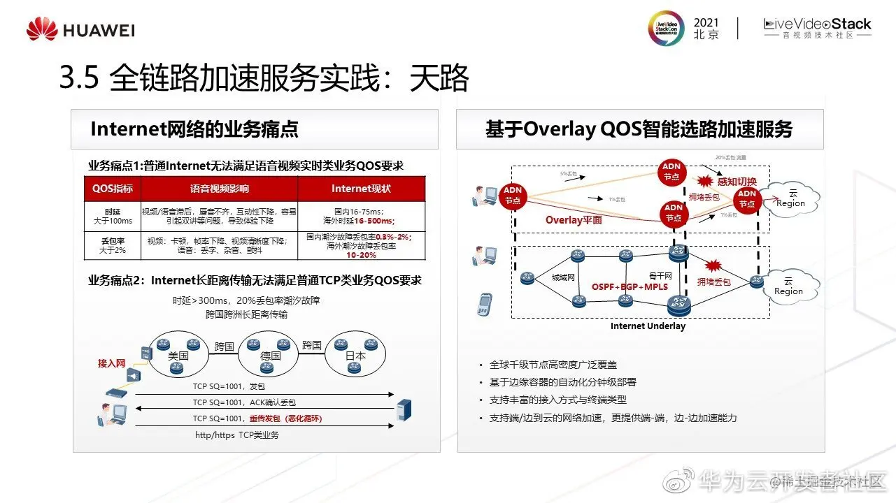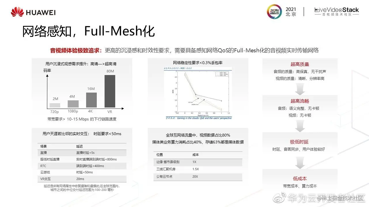 另外,要支撑极致体验,还需要一张具备带宽、时延和可靠性三个核心特征的媒体网络。,具备感知QoS质量的Fullmesh化实时音视频网络。