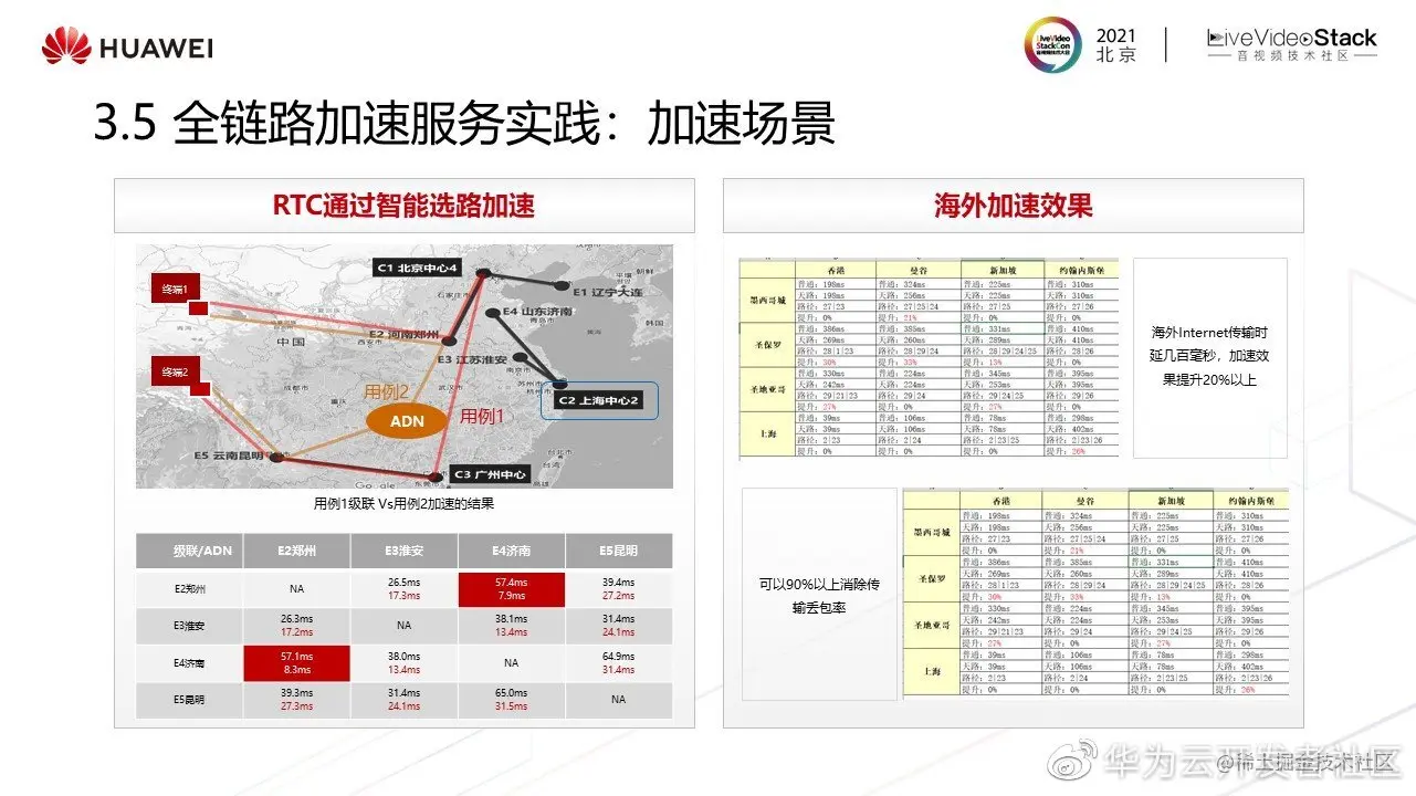 基于全链路传输加速服务,应用于国内RTC加速场景,从测量数据上看,ADN选择的路径时延要小于级联架构组网下RTC的时延,在极端情况下对比更明显。部分路径优势非常明显,如郑州到济南,从50ms提升至10ms以内。应用于海外加速效果,时延加速在Internet传输的几百毫秒的基础上平均提升20%,全球时延在200ms以内,消除了90%的丢包场景。