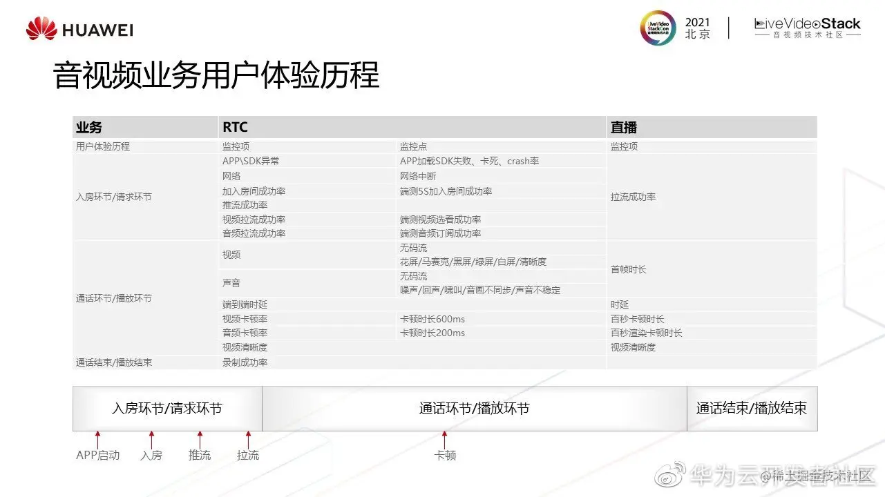 首先分享下华为云音视频媒体体验质量体系,华为云以用户为中心,从用户使用不同音视频业务的生命周期体验历程去看体验质量。入房请求阶段,用户关注的是快速看到内容,这一阶段的核心关注项是拉流成功率、首帧时长、时延等指标。播放环节用户关注的是播放是否清晰流畅以及端到端到时延。