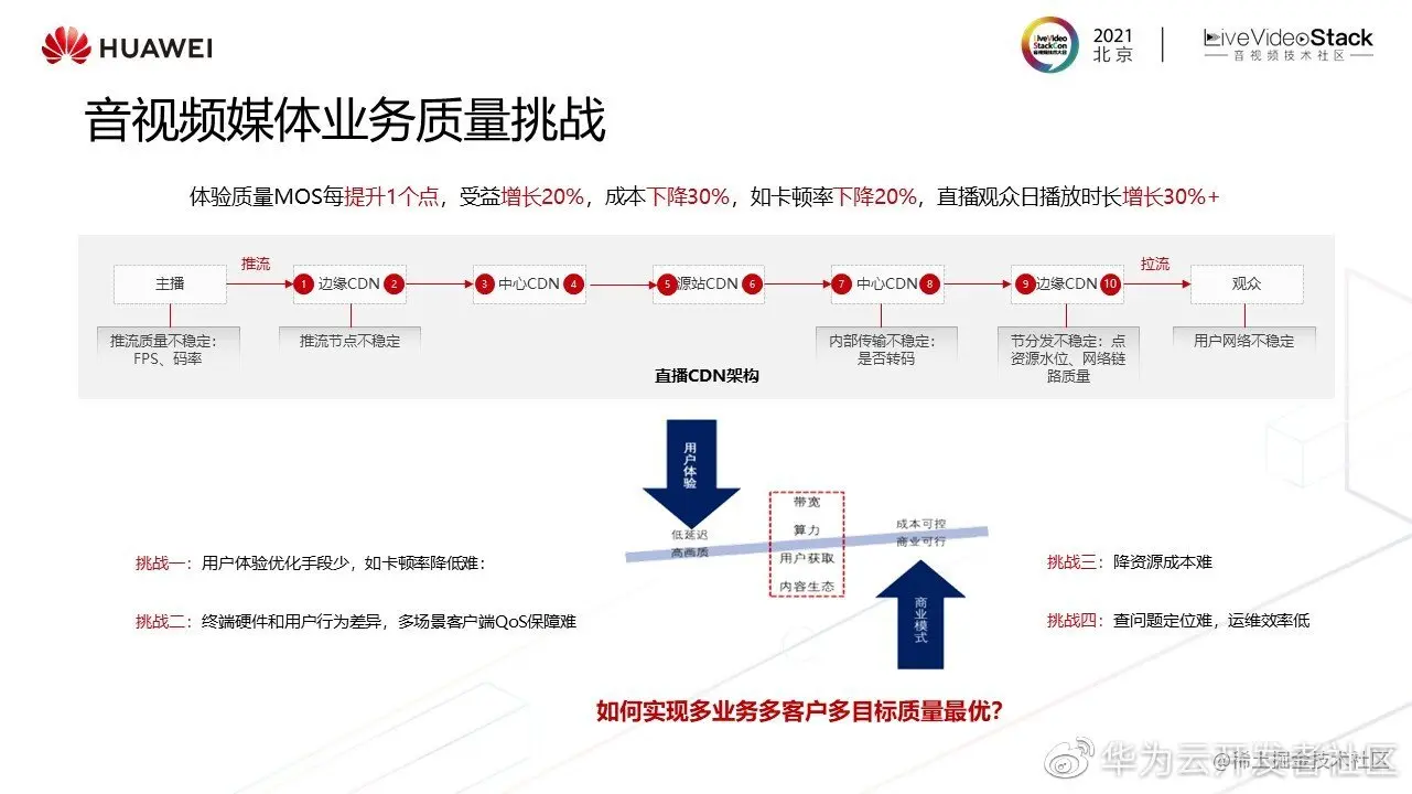 以上是新需求,再来看一下音视频媒体业务面临的质量挑战。众所周知,体验质量对业务至关重要:体验质量每提升1个点,受益预估可以增加20%,而且成本会下降30%。从直播来看吗,如果我们能将直播卡顿率降低20%,整个直播播放时长,能增加30%以上。但体验质量优化提升面临的挑战也非常大,以直播业务媒体网络结构为例,从推流、拉流、传输、到分发,任何一个环节出现不稳定的情况,都会导致终端播放体验变差。总体而言,目前音视频业务普遍面临着以下四大挑战: