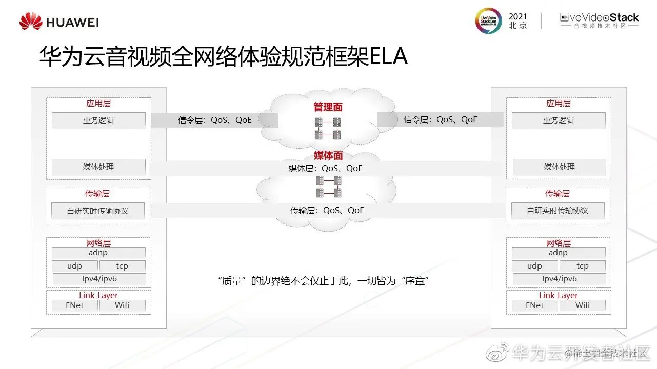 音视频媒体网络是基于不可靠组件和不可靠互联网络,在全球范围构建大容量分布式系统,来保障用户确定的实时音视频互动体验需求。为解决音视频体验质量无章可循、不可衡量、无保障的痛点,基于用户体验历程,从保障的维度范围我们综合端、网络,从传输层、媒体层、信令层定义了一套华为云音视频全网络体验规范框架ELA,各个音视频业务都可以参照这个框架来定义体验质量。
