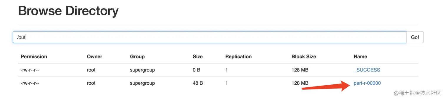 -rw-r--r-- 1 root supergroup 0 2021-12-06 18:28 /out/_SUCCESS