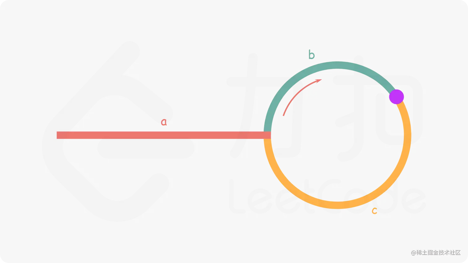 设链表中环外部分的长度为 a。slow 指针进入环后,又走了 b 的距离与 fast 相遇。此时,fast 指针已经走完了环的 n 圈,因此它走过的总距离为 。