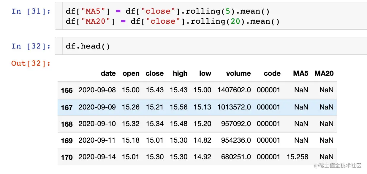 下面的代码是添加5日和20日的均线数据: