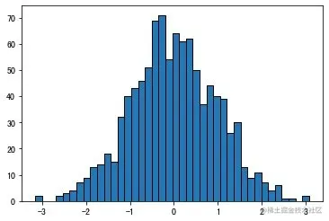 plt.hist(data, bins=40, edgecolor="black")