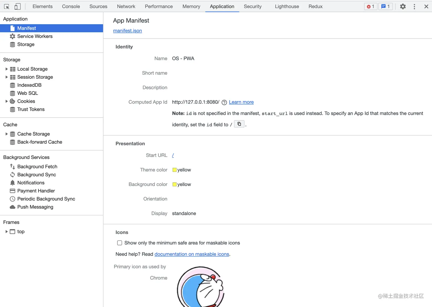 打开浏览器的调试工具 如果 manifest 一项显示如下 则表示你配置正确了