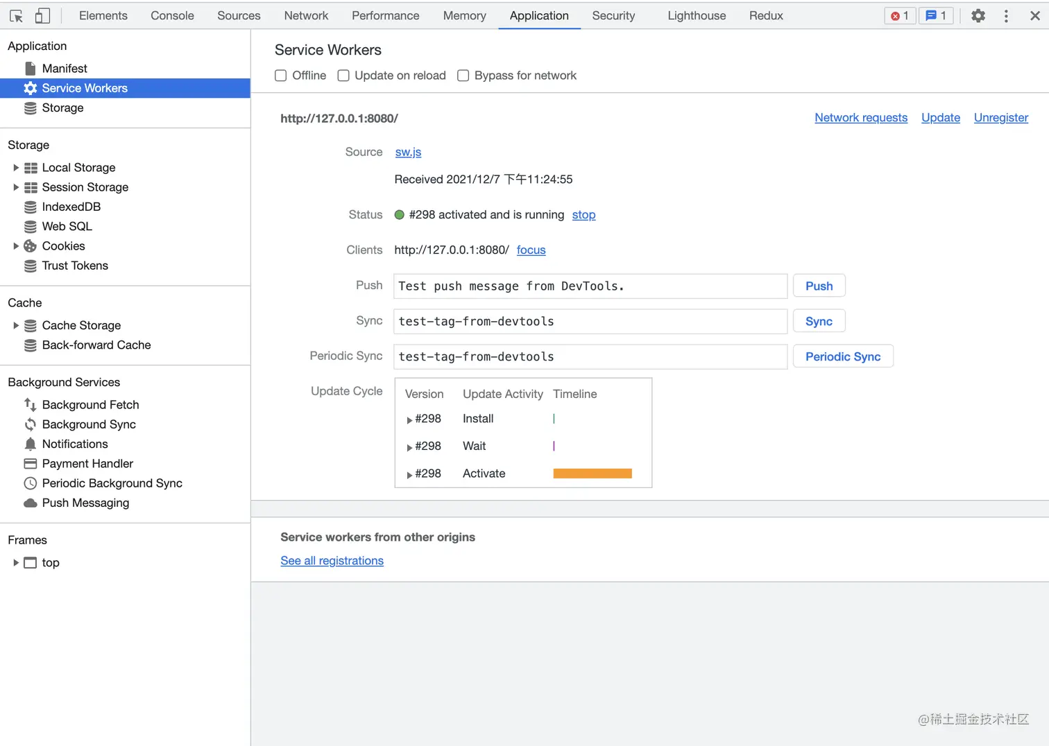 这样便完成了一个注册 打开浏览器的调试工具 这次你可以在 service worker1 一栏中看到内容