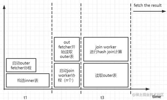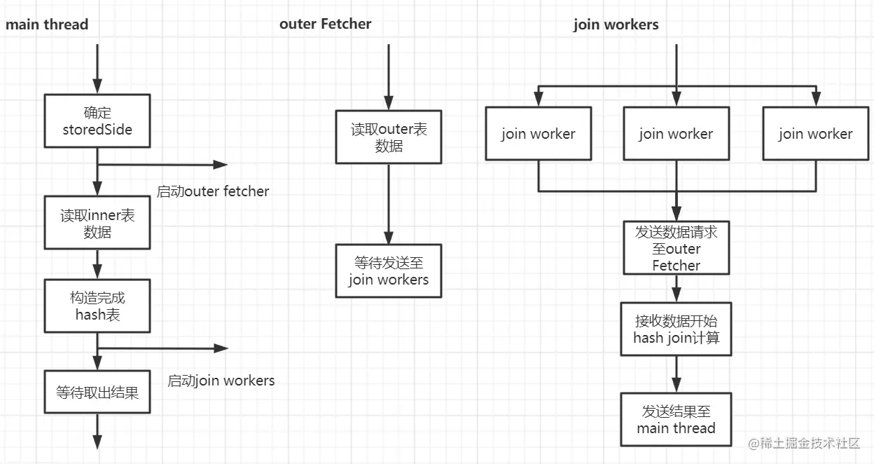 - Join Workers(协程):将 Outer Fetcher 发送来的数据进行 hash join 计算;将计算结果通过 channel 发送至 Main thread。