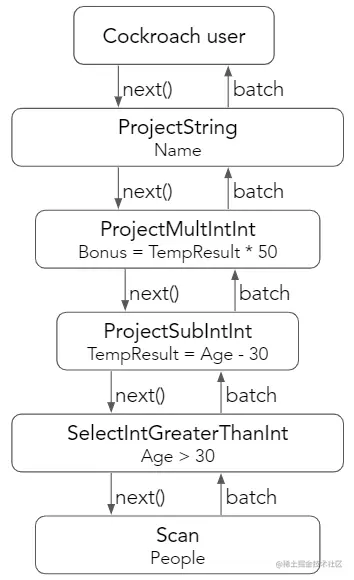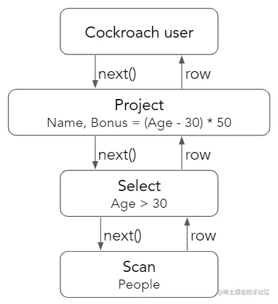 这样的语句查询,在火山模型中,顶级用户向 Project 算子请求一行,该请求被传播到底层的 Scan 算子。扫描从键值存储中读取一行,并将其传递给 Select,Select 将检查该行是否通过了 Age> 30 的谓词。如果该行通过了检查,则将其返回给 Project 算子以计算 Bonus = (Age - 30) * 50 作为最终输出。