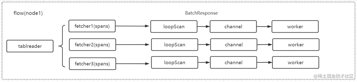 当 tablereader 下发到了对应节点后,再将 Spans 进行均匀分配进 tablereader 的各个 worker fethcer 当中进行并行的数据读取: