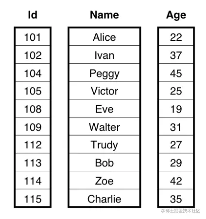 举例来说,请考虑一个包含三列的 People 表:Id,Name 和 Age。在火山模型中,每个数据行由每个算子处理一次 —— 一种逐行执行方法。相比之下,在矢量化执行引擎中,我们一次传递了有限大小的面向列数据的批处理。我们使用一组列,而不是使用元组数组的数据结构,其中每一列都是特定数据类型的数组。在该示例中,分批处理将由一个Id的整数数组,一个 Name 的字节数组和 Age 的整数数组组成。下图显示了两个模型中数据布局之间的区别: