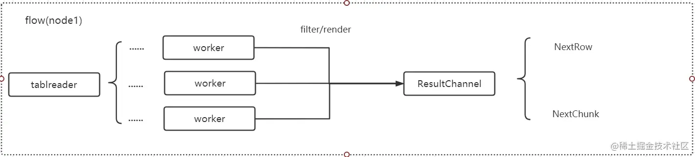 Step3:数据返回,每个 fetcher 的 worker 协程处理(经过 filter 或 render )完每行 kv 数据后都会放入一个 buffer 当中(默认 buffer 缓存<= 64 行),每个 worker 每完成一个 buffer 会将该 buffer 放入 tablereader 的结果管道中,提供 NextRow 和 NextChunk 两类接口供上层算子调用: