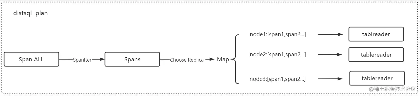 Step1:Span 拆分,逻辑计划完成后会生成一个 Span ALL(索引、主键查询除外),Span ALL 会根据 table 的 range 边界拆分从成多个范围更小的 Span,每个 Span 会获得相应的 range 信息,根据 rangeID 可以取得对应 range 的副本信息,再根据副本选择策略(就近选择、随机选择、lease holder(默认)),获取到对应副本的 nodeID,再将该 Span 放入一个 Map 结构(Map[nodeID][]Span)中;
