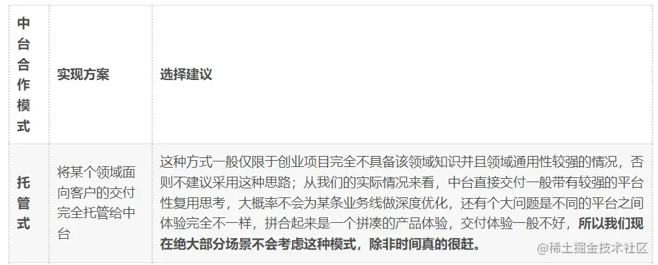 基于 CTO 责任制和中台要不要合作,如何合作,是版块负责人考虑业务诉求、能力现状,技术成本,未来的迭代和维护成本等指标进行综合决策;也就是不存一定要用或者一定不用的逻辑;也不存在一定要用某种技术合作方式的逻辑,甚至不同模块可以采用不同的决策;但是这种决策的后果也是 CTO 需要去承担的,所以往往如何决策是一个非常复杂的课题,需要经验上面的长期摸索。