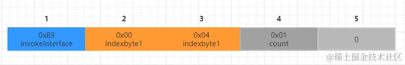 其他的invoke指令的后面就是2个字节的操作数,拿着操作数去常量池中就可以找到类信息、方法信息。但是invokeinterface你会发现,它后面操作数占了4个字节,这4个字节还不全是常量池索引,一起看下这个指令的结构,上图: