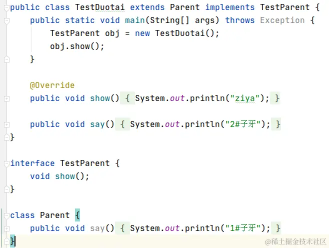 顺便说下,经常跟多态联系在一起的两个词:动态绑定、晚绑定。别到时面试官说这两个词,你一脸懵,那真的很掉分,面试官的脸色一下就暗淡灰沉下去了。当面试官看到你的第一眼,心里给了你60分钟时间来表现,这下直接掉到5分钟。更直接一点的,可能找个借口就走人了。
