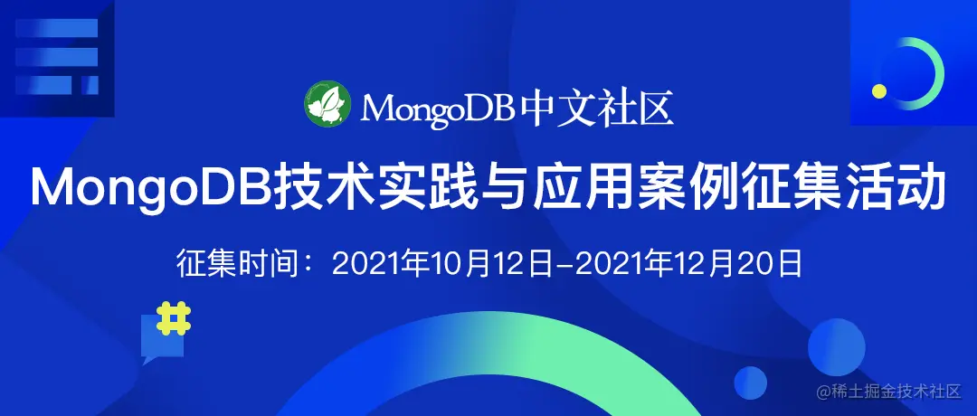 通知:为了邀请更多用户朋友分享自己的实践与见解,原定于2021年11月30日截止的MongoDB技术实践与应用案例征集活动截稿现已延期至2021年12月20日。