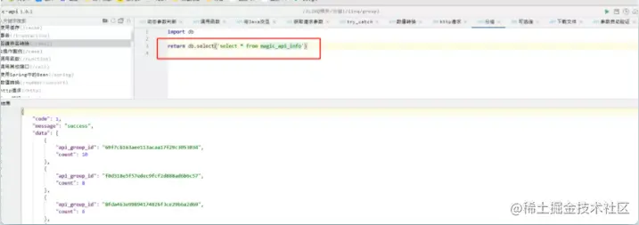 但上边只是静态数据,在实际开发中往往要与数据库打交道,magic-api提供了一些类似于python开发中的模块化组件,例如引入import db 模块,直接执行SQL语句会返回JSON格式数据,省略了很多中间步骤。