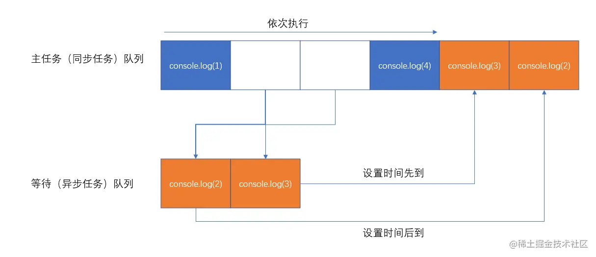像上述的例子中js程序逐行读取执行,但是执行到setTimeout这个异步任务之后,,会把回调任务中的内容放到异步任务队列中,等异步任务可以执行后再加入到主任务队列中。