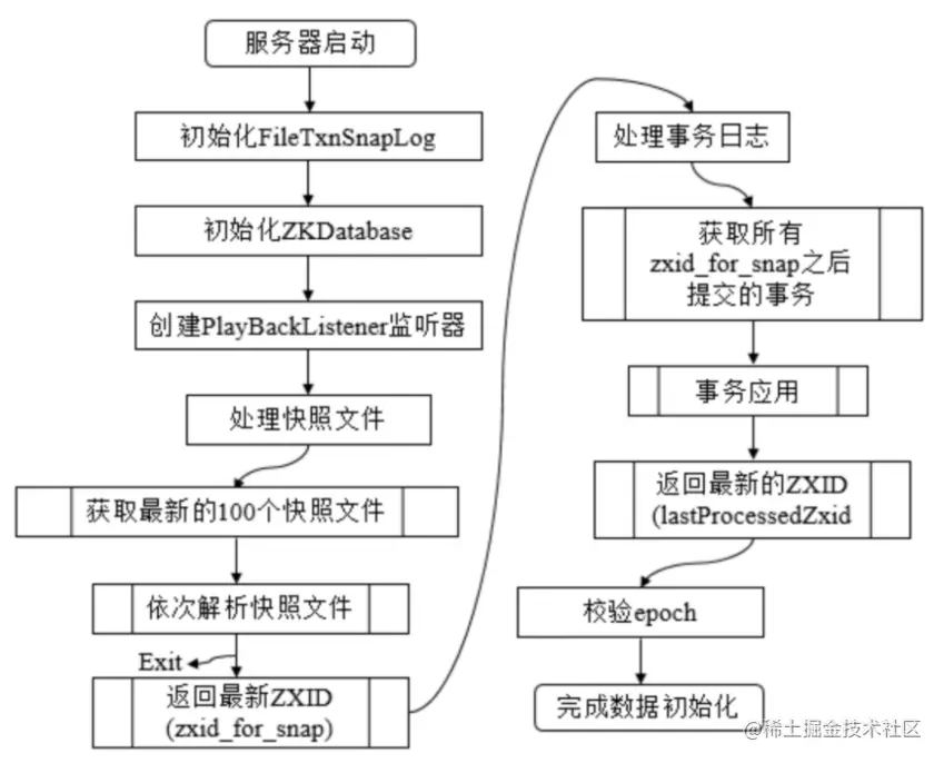 数据的初始化工作是从磁盘上加载数据的过程,主要包括了从快照文件中加载快照数据和根据实物日志进行数据修正两个过程。
