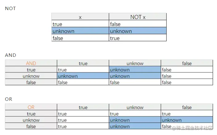 这个三值逻辑不是三目运算,指的是三个逻辑值,有人可能有疑问了,逻辑值不是只有真(true)和假(false)吗,哪来的第三个?说这话时我们需要注意所处的环境,在主流的编程语言中(C、JAVA、Python、JS等)中,逻辑值确实只有 2 个,但在 SQL 中却存在第三个逻辑值:unknown。这有点类似于我们平时所说的:对、错、不知道。