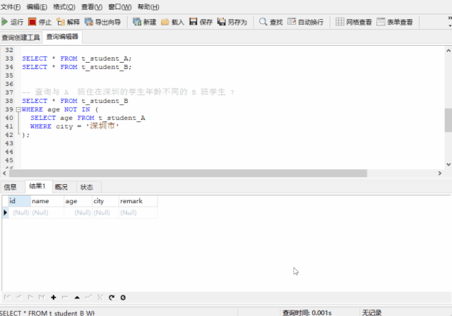 -- 查询与 A 班住在深圳的学生年龄不同的 B 班学生 ?