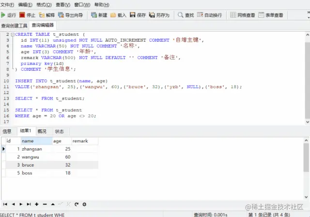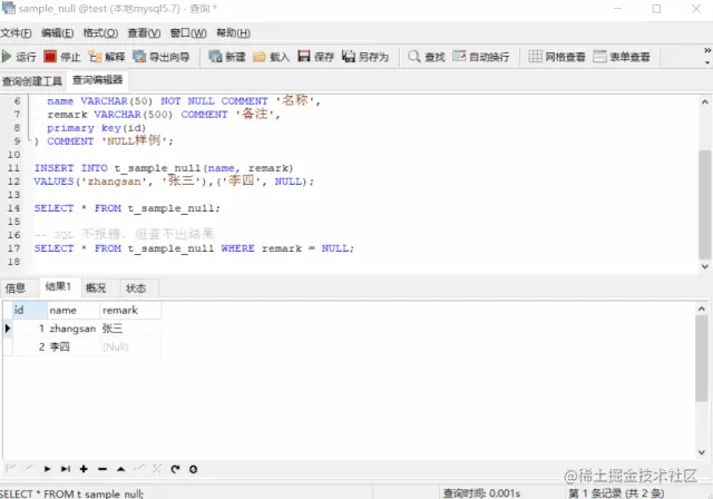 我们要查询备注为 NULL 的记录(为 NULL 这种叫法本身是不对的,只是我们日常中已经叫习惯了,具体往下看),怎么查,很多新手会写出这样的 SQL
